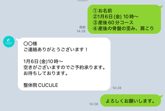 ①お名前②予約希望日時③希望コース④症状
